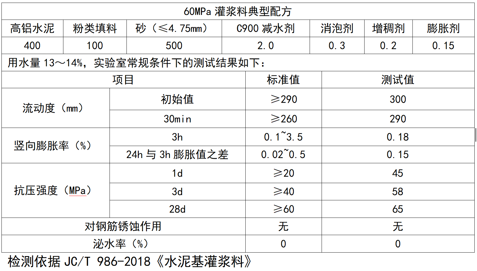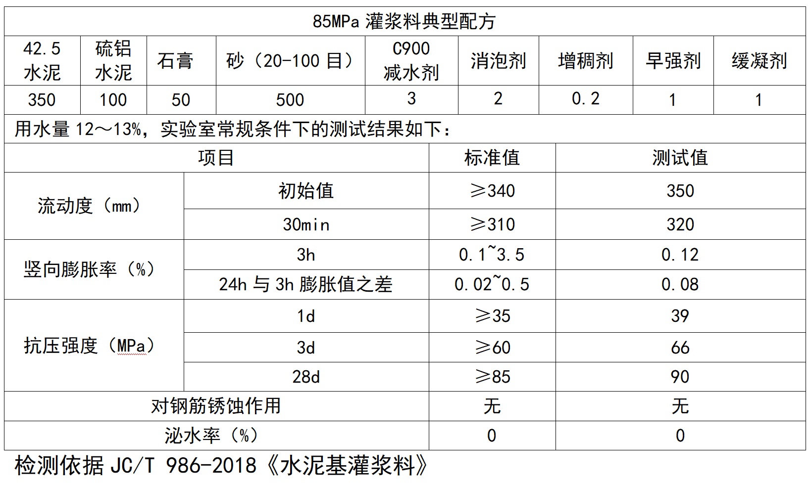 C900聚羧酸減水劑在高鋁水泥灌漿料中典型數據: